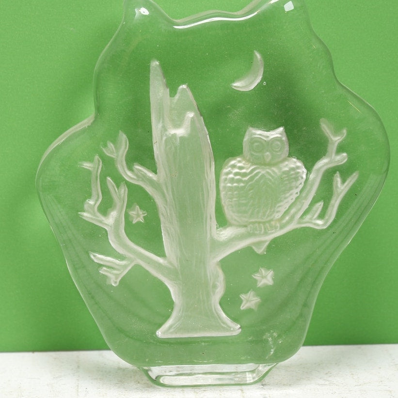 Art Glass Owl Sitting on Tree Moon Paperweight